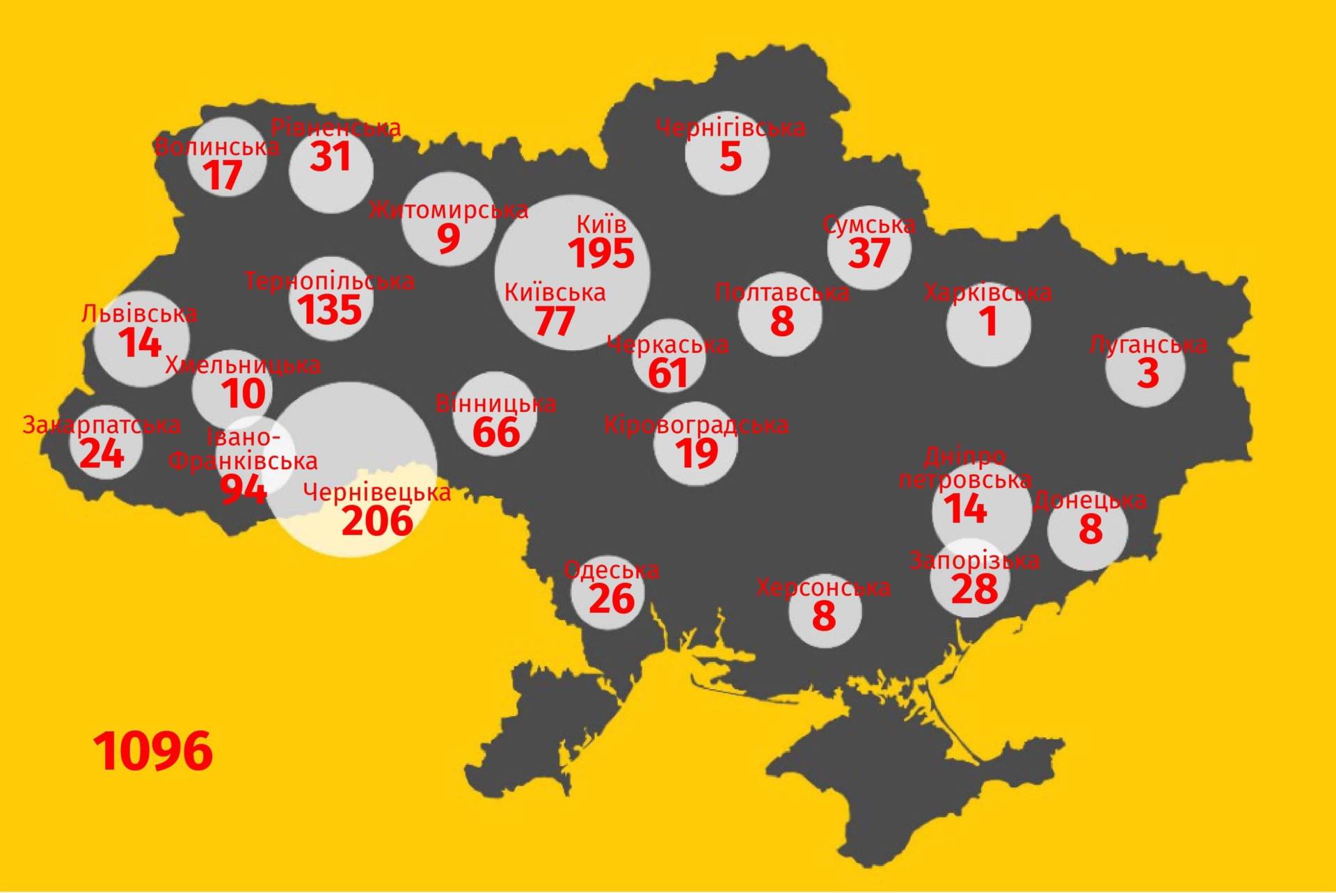 В Україні офіційно — 1096 випадків COVID-19 (дані за областями, інфографіка) Стасюк Ірина · 4.4.2020 · 9:51 Covid-19Карантин