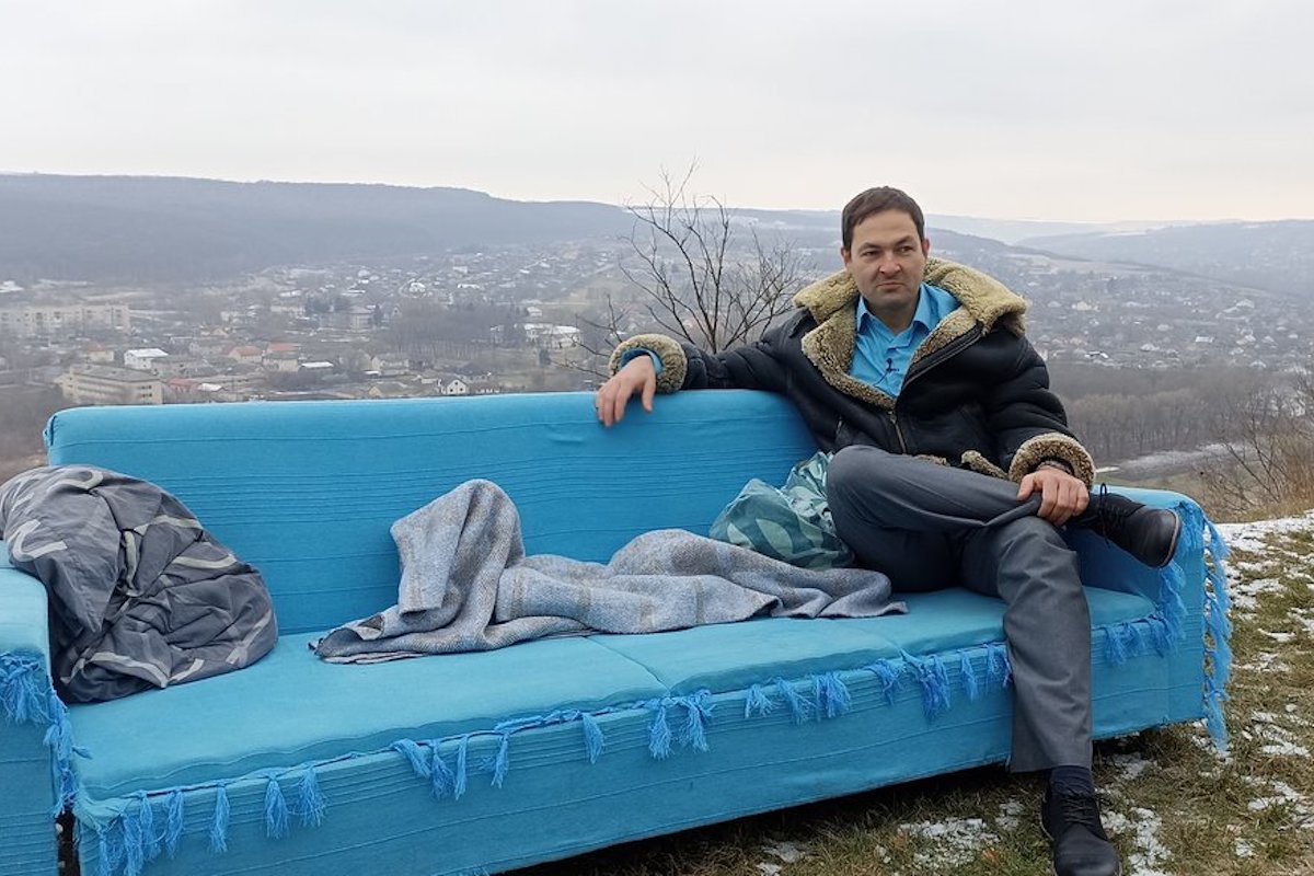 Українець їздить містом на блакитному дивані (відео) #нечос Стасюк Ірина · 7.1.2024 · 10:56 вуличні меблі